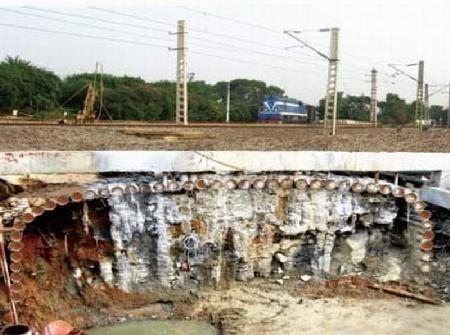 管幕施工時沿隧道軸線方向采用密排法將φ299mm的鋼管水平直線鋪設在土體里,與隧道外輪廓最小凈距25cm,并在φ299mm鋼管連接處打入φ60mm鋼花管進行管幕內外回填注漿,對土體進行注漿加固并使φ299鋼管成為一個整體。在施工過程中確保導向鉆孔精度,然后擴孔與拉管同時完成,并及時注漿,成功控制了地面及鐵路軌面沉降,確保了鐵路正常運行及隧道施工的安全。